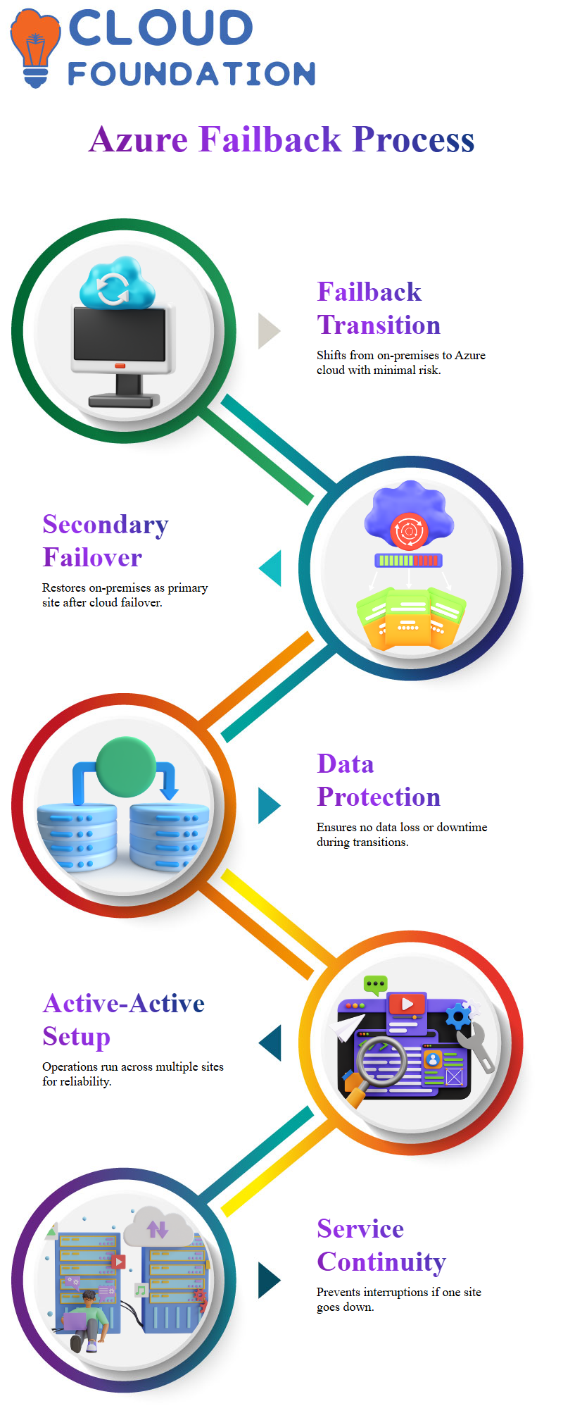 Transitioning back from an on-premises environment to a cloud environment in Azure is one possibility. The main aspect in the failover process used to initiate failback is yet the secondary failover which returns the on-premises environment back to its status as primary site.