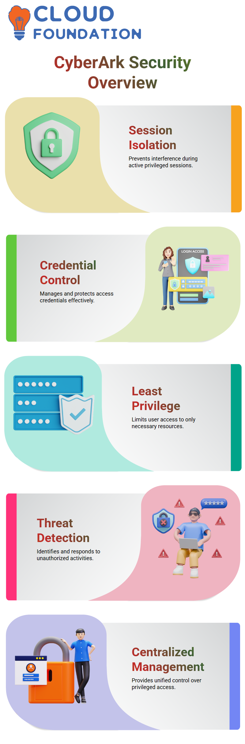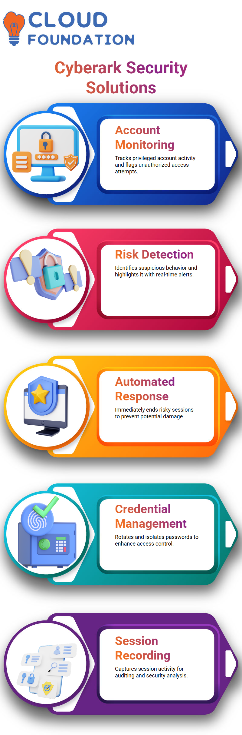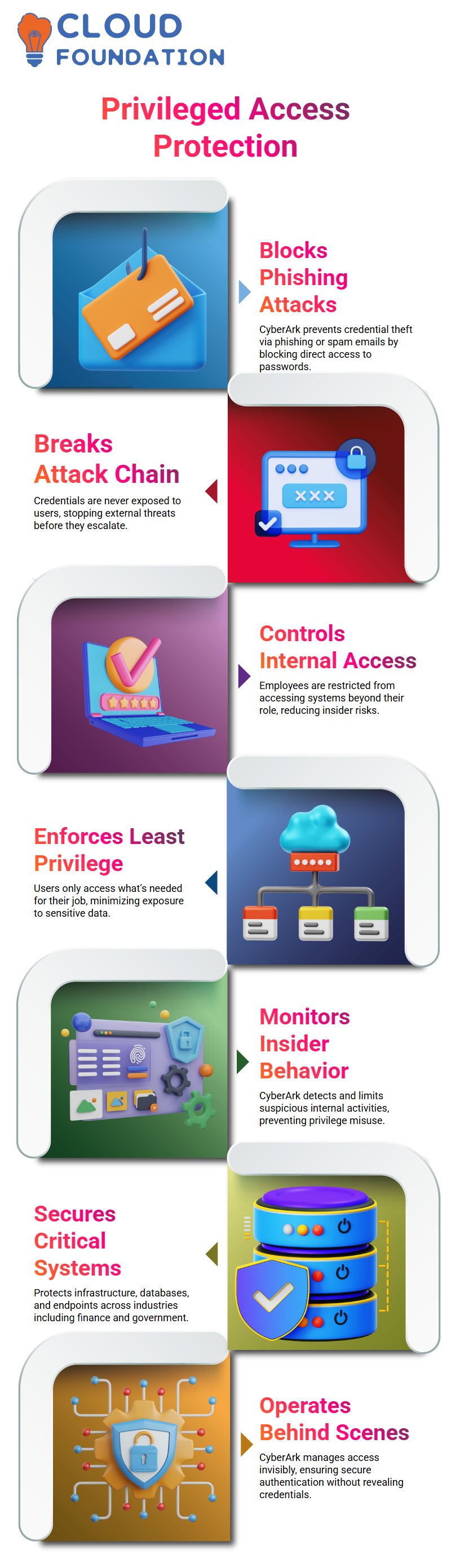 Cyberark keeps track of any attempts to abuse access before departing and guards against system corruption.Cyberark is the enforcement point for me; it enforces the automations I create and blocks instructions that can destroy PAM components.