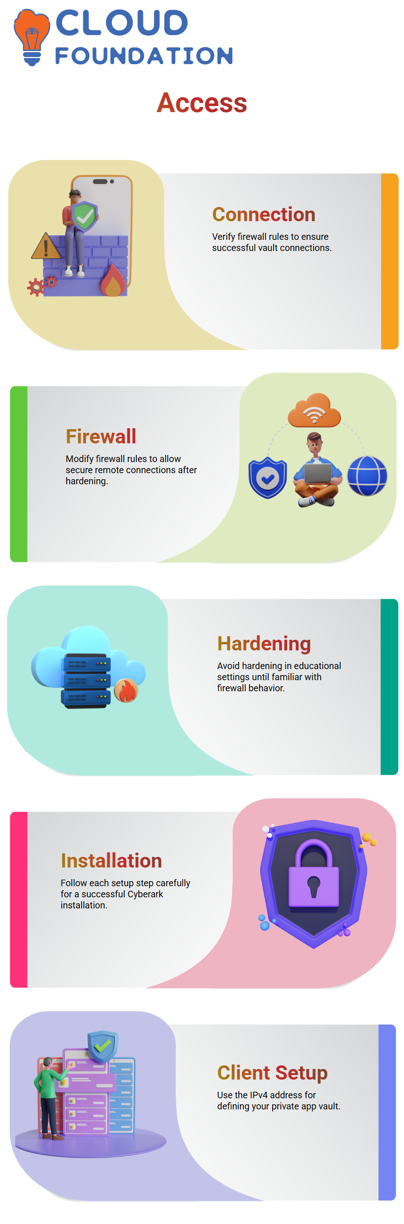 I remembered a time when the system was hardened and the firewall rules weren’t changed, which prevented the vault from connecting. All incoming connections functioned flawlessly this time as I had omitted hardening. One important lesson from Cyberark is to carefully check firewall rules before moving forward, even if your vault is protected.
