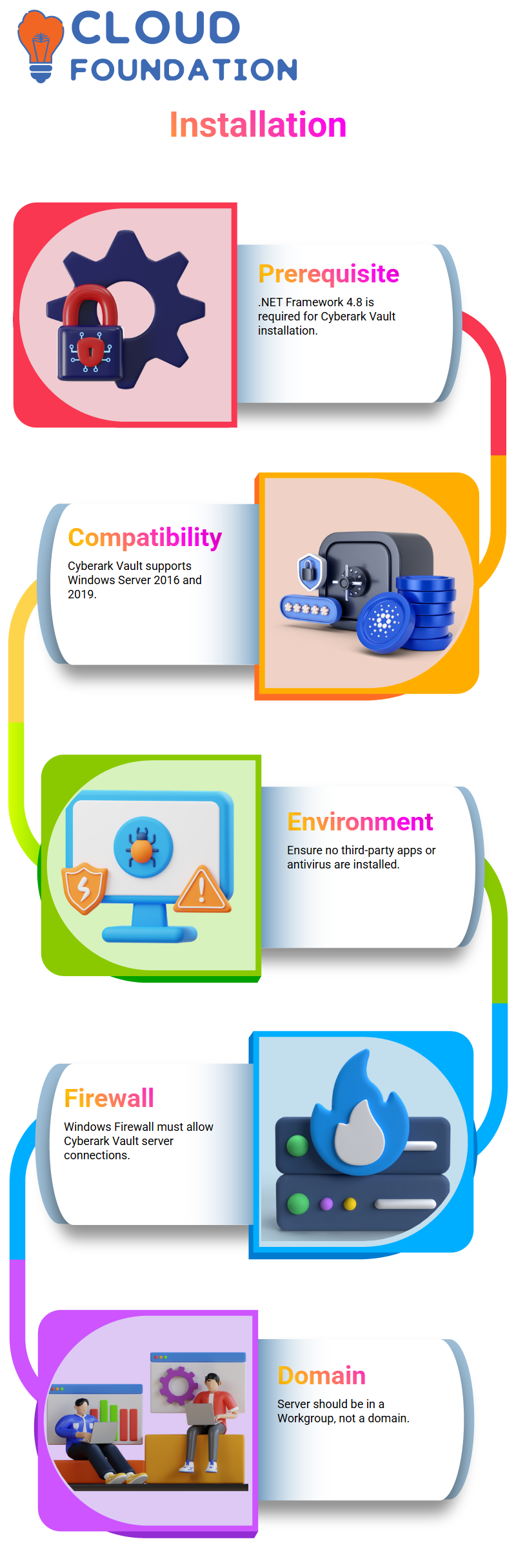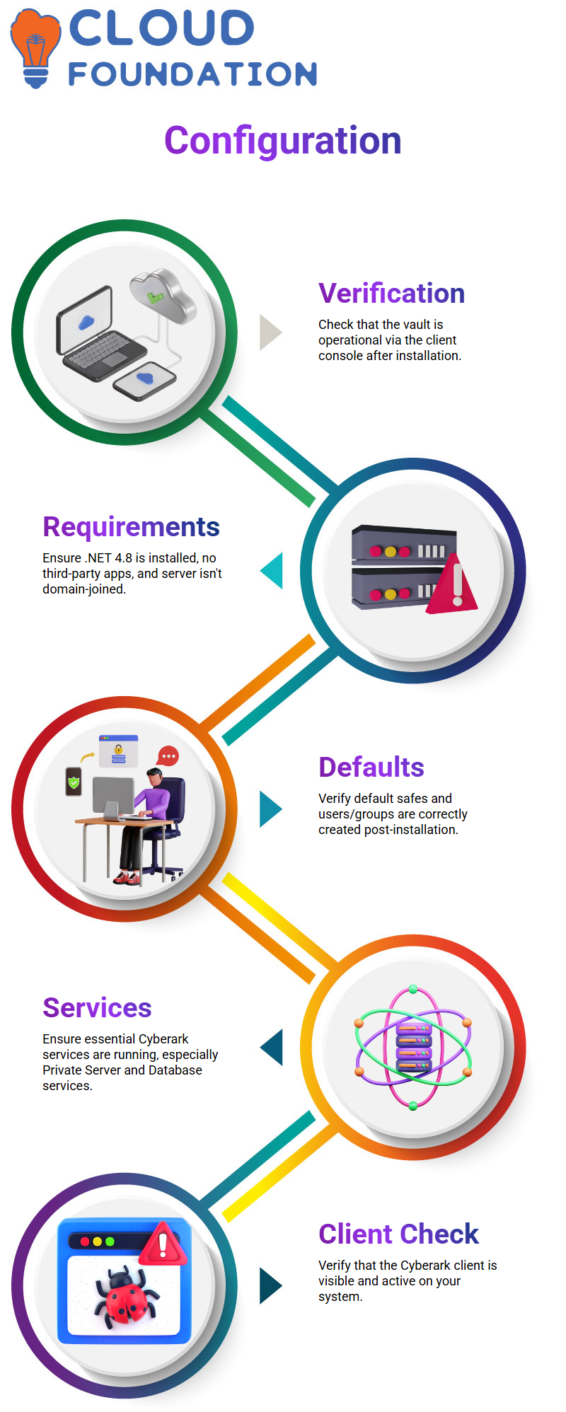 Making sure the firewall is configured correctly, the.NET Framework is installed, and no third-party software is installed is similar to preparing the home. The whole Privileged Access Security ecosystem is strengthened at each stage of the Cyberark Vault installation procedure.