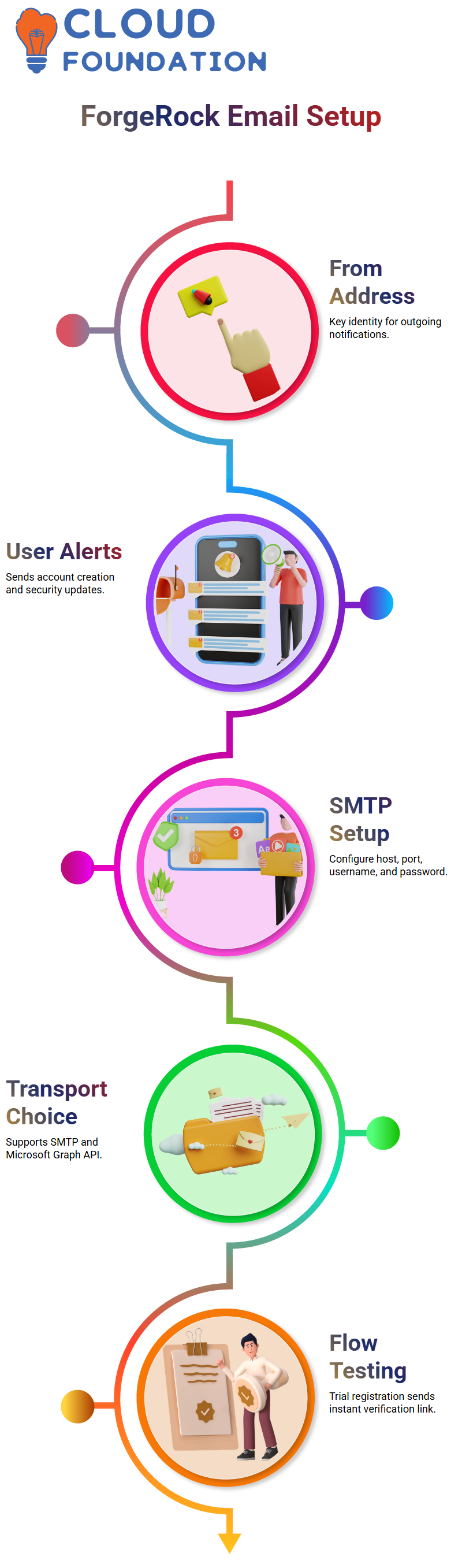 ForgeRock supports multiple transport types, including SMTP and Microsoft Graph API, but most organizations rely on SMTP because it fits easily with internal email systems.