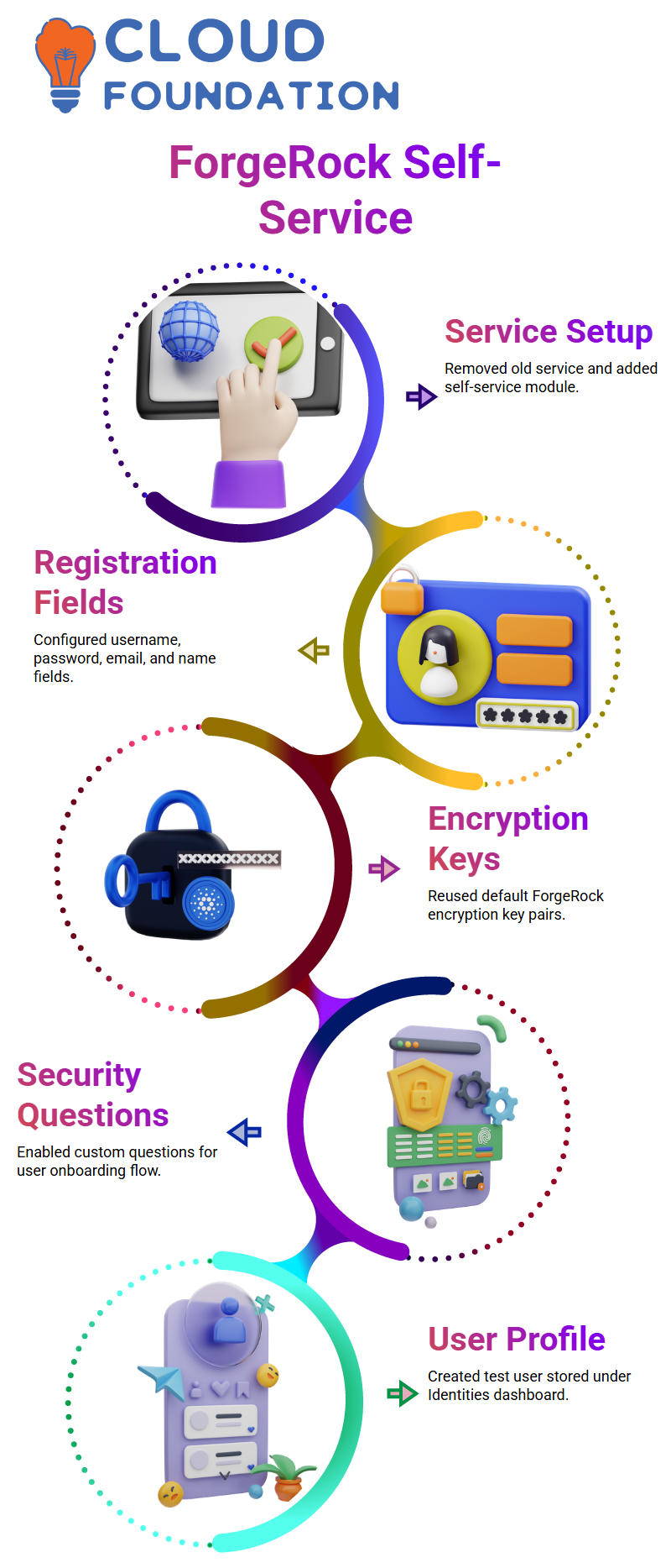 ForgeRock already provides default encryption key pairs, so I simply reused those. I enabled user registration, forgot password, and forgot username.