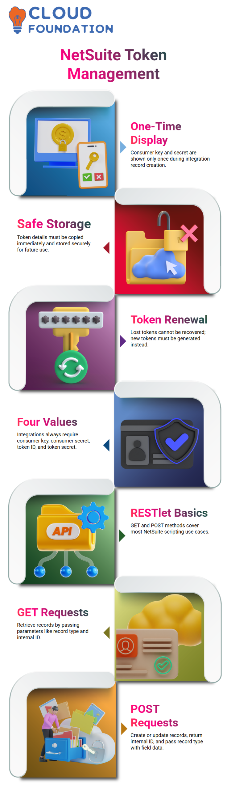 You only see token details once, which is an essential NetSuite rule that I stress. The consumer key and consumer secret only show up when I create an integration record in NetSuite.