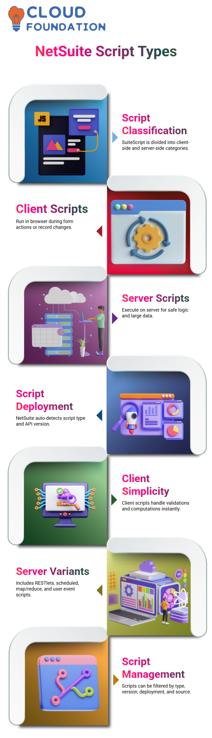 Over time, choosing the appropriate script type becomes instinctive in NetSuite technical practice. While server-side scripts include REST lets, scheduled scripts, map/reduce scripts, and user event scripts, client scripts are simple.