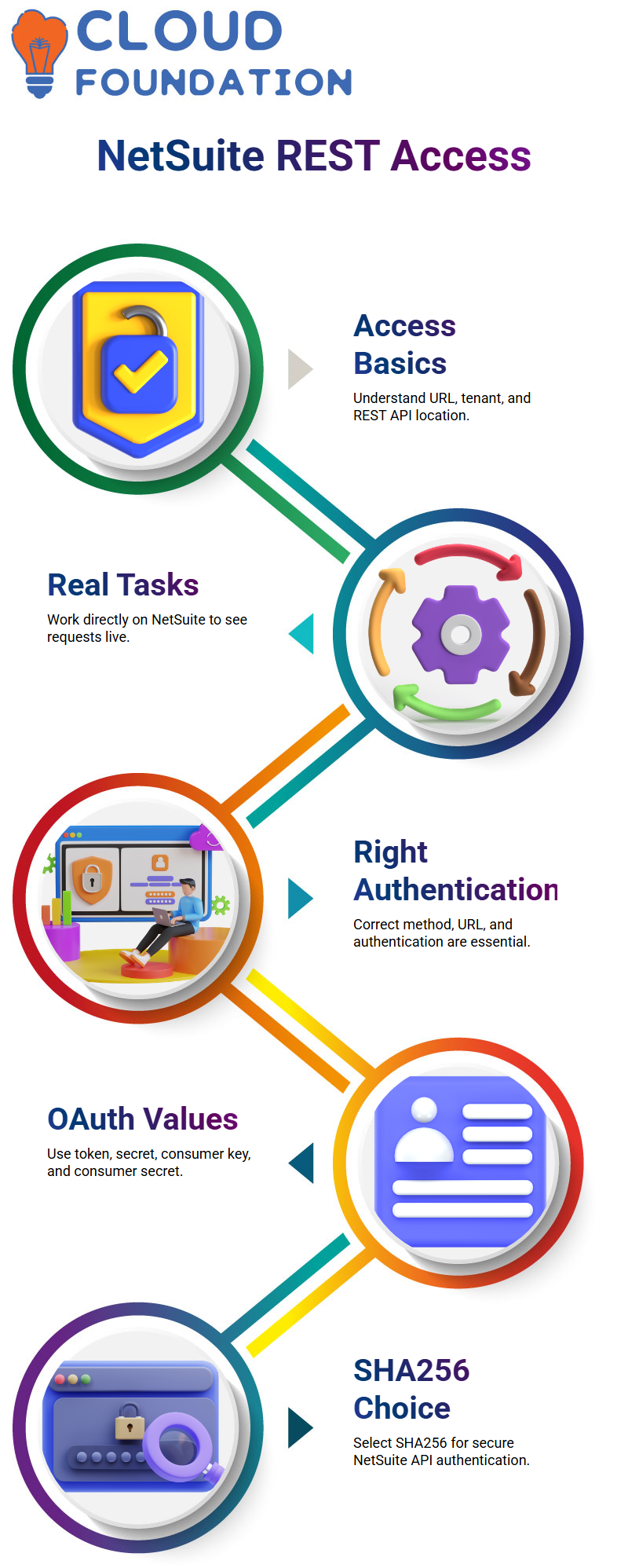 OAuth 1.0 is often used for NetSuite authentication, and I make sure Learners get why. Four values are required: access token, token secret, consumer key, and consumer secret.