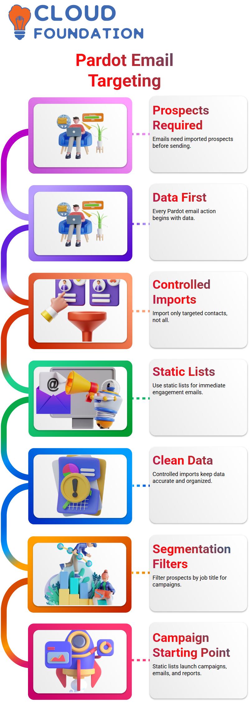 Salesforce Pardot can’t send anything without that. Every email action in Salesforce Pardot begins with data.