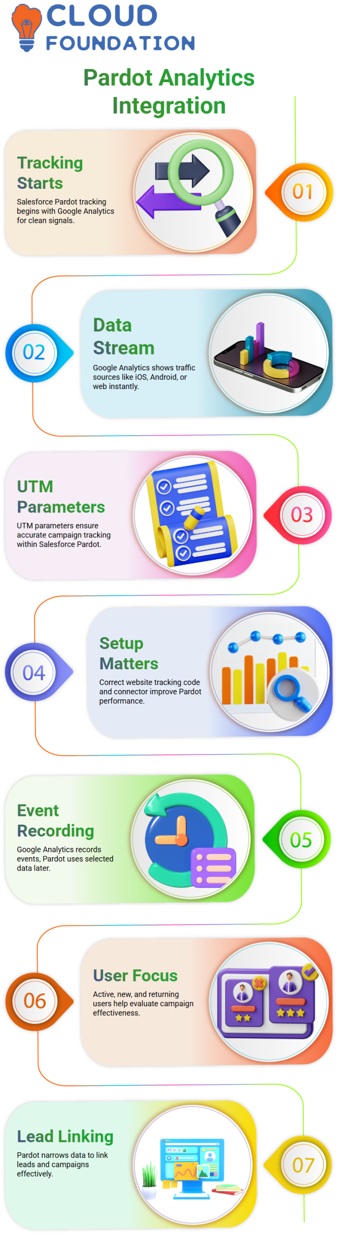 Salesforce Pardot doesn’t replace Google Analytics; it needs Google Analytics for clean tracking signals, especially when UTM parameters are used.