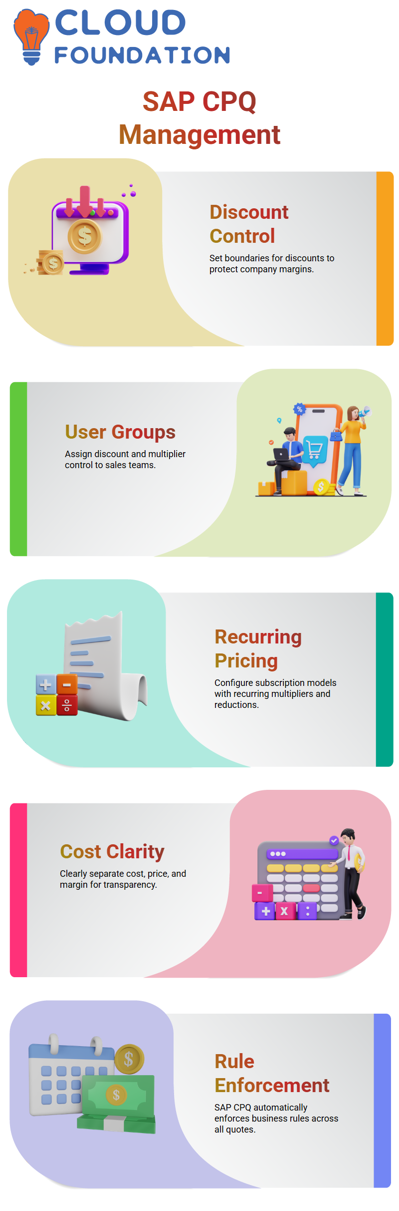 I go directly to SAP CPQ’s pricing and computations area after setting up the main settings. I control and activate multipliers and discounts here. I always specify which user group in SAP CPQ has the ability to modify these variables, and I often give the sales staff this task.