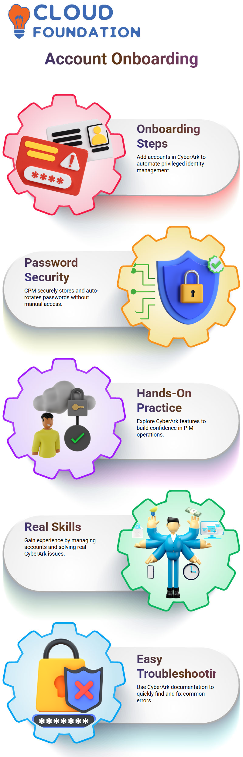 What precisely occurs when an account is onboarded in CyberArk, then? The procedure is simple yet effective. The user is created at the server end by the IAM team. It is your responsibility to launch CyberArk, choose ‘Add Account,’ fill out the information, and finish the onboarding process.