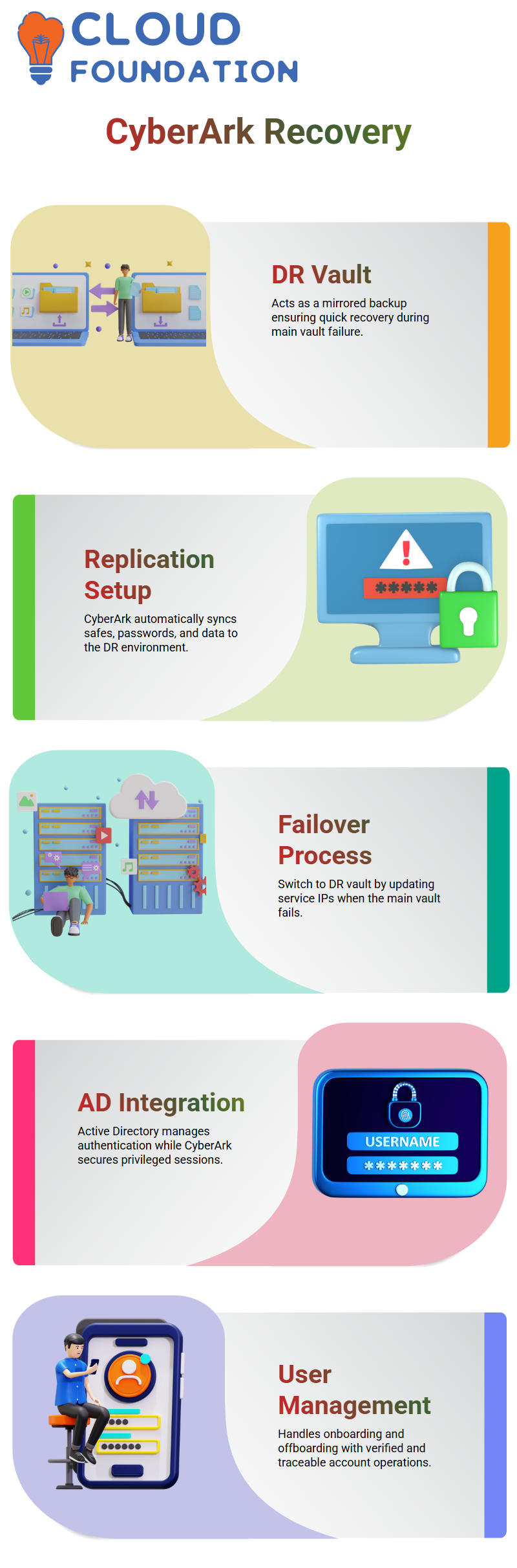 The goal is to guarantee that I can promptly go to the DR Vault and carry on working without losing important login credentials or access routines in the event that the primary Cyberark vault fails for any reason.
