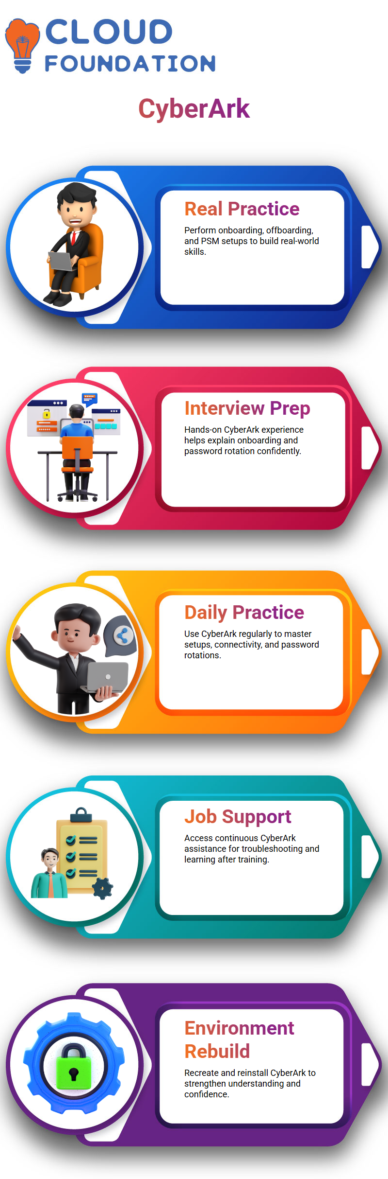 CyberArk’s ability to go beyond theory is one of its many wonderful features. To strengthen your comprehension, you may regularly perform activities like onboarding, offboarding, and establishing PSM servers. Mastery is gained with each repetition.