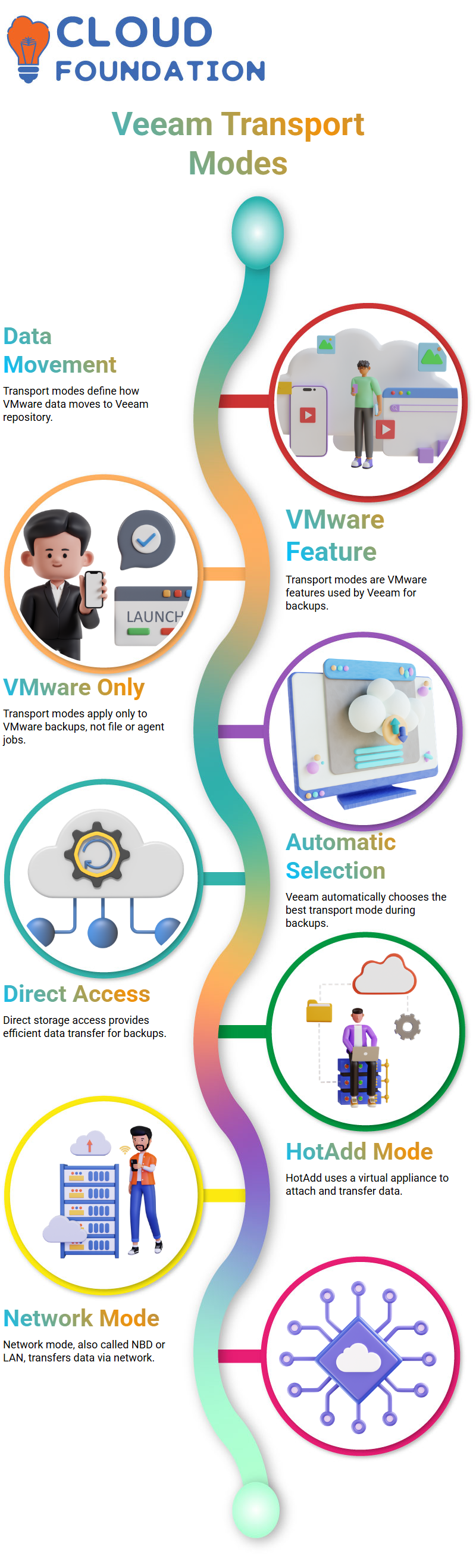 Veeam’s transport modes determine how data moves from the VMware environment to the Veeam backup repository.