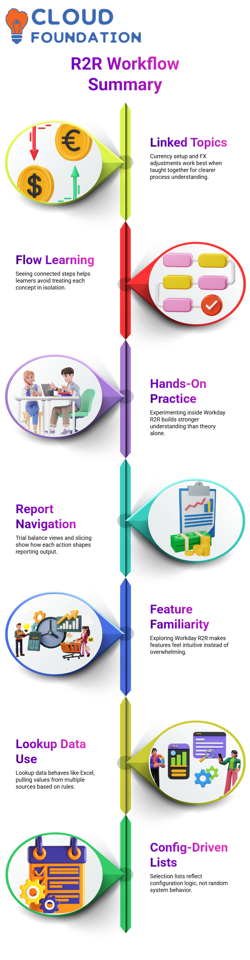 Workday Finance R2R topics like currency setup and multi-currency accounting naturally connect to FX rate adjustments, so I prefer teaching them together.