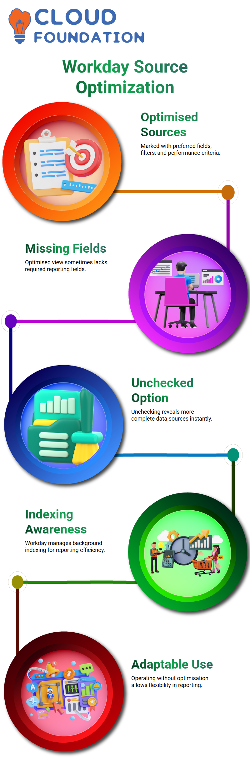 When a data source is marked as optimized by Workday, it essentially indicates that its favorite fields, filters, and performance criteria have been applied.