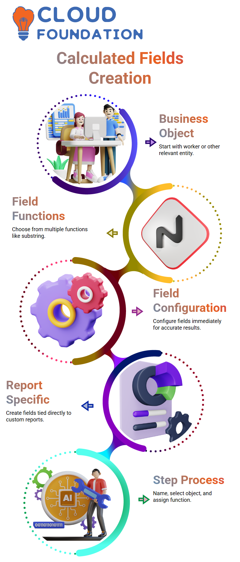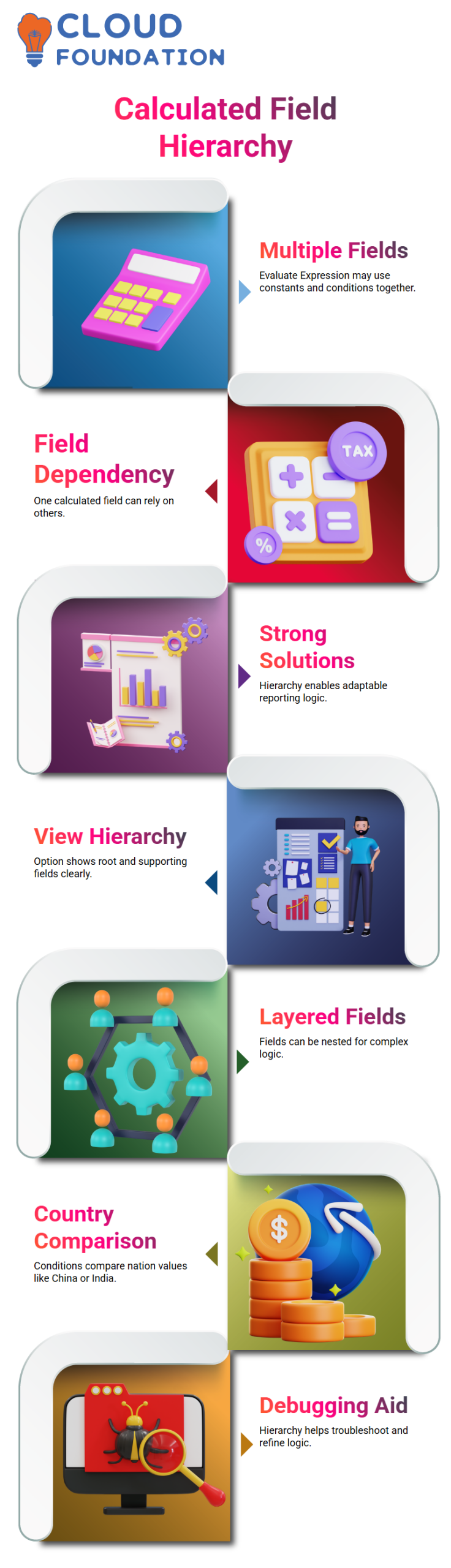 I always want my leaners to grasp this hierarchy. One calculated field in Workday Integration may rely on several other calculated fields. You can create strong and adaptable solutions if you know how each component works.