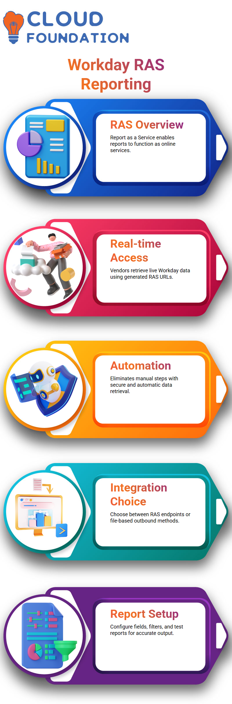 This method gets rid of the need for human steps and lets data be retrieved safely and automatically. In simple words, Workday Integration RAS works a lot like a REST-based service.