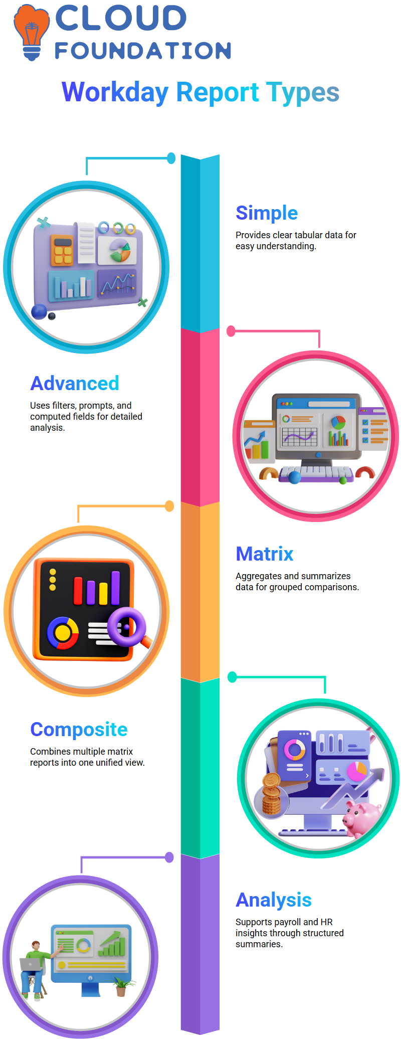 When someone inquires about the sorts of reports available in Workday Reporting, I explain that there are four primary categories: Simple, Advanced, Matrix, and Composite reports.